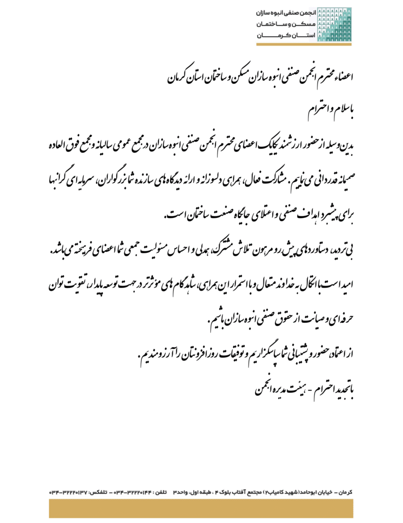 انجمن صنفی انبوهسازان کرمان با هدف ارتقای کیفیت ساختوساز، حمایت از اعضای صنف و توسعه پایدار فعالیت میکند. این انجمن، با بهرهگیری از تخصص و تجربه اعضا، در ارائه خدمات مشاوره، آموزش و نظارت بر پروژههای ساختمانی پیشرو است. ما با رعایت استانداردهای ملی و تعامل با نهادهای مرتبط، برای بهبود زیرساختهای شهری و مسکن باکیفیت تلاش میکنیم.